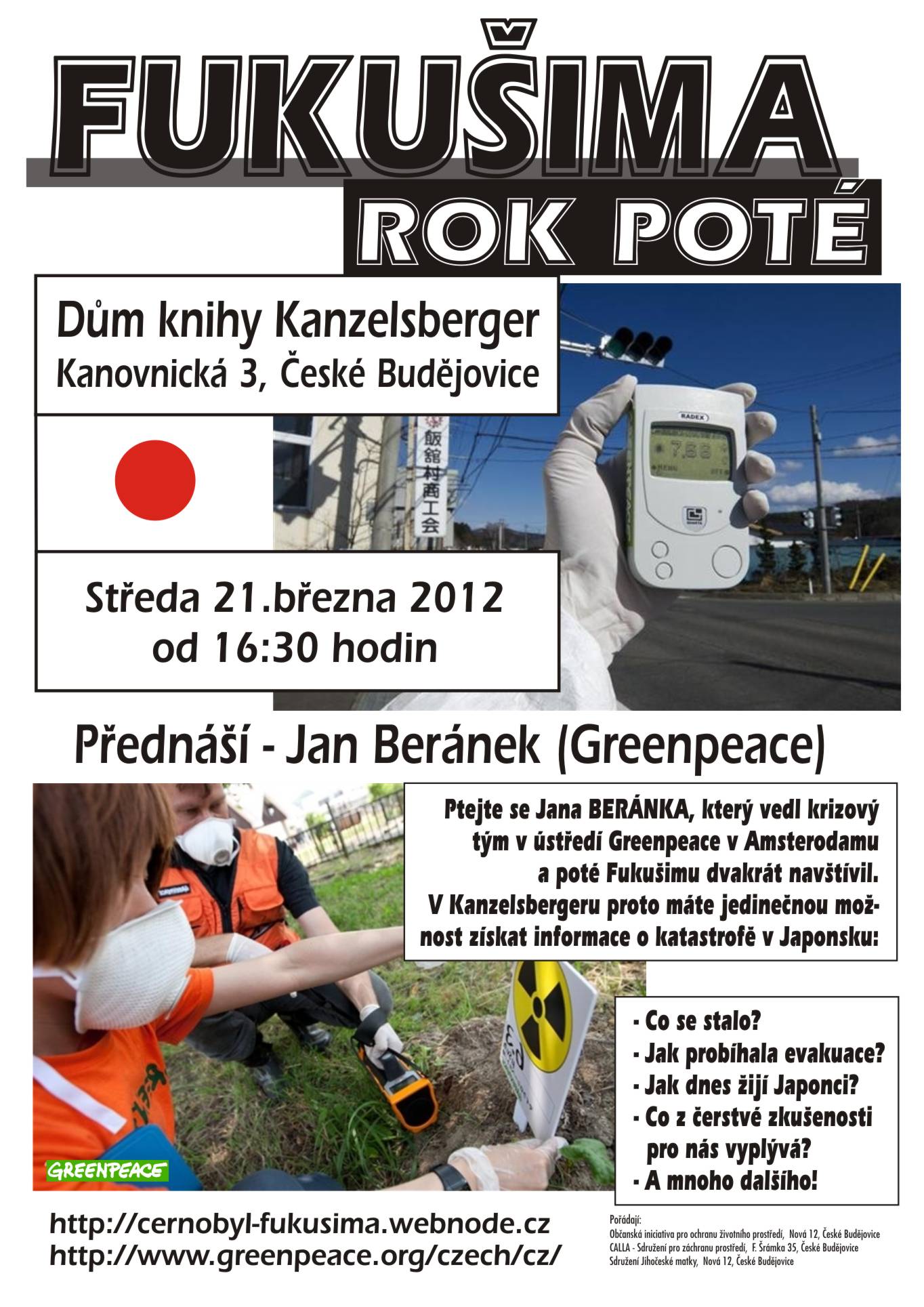 "Fukušima - rok poté", to je název přednášky s besedou s Janem Beránkem z Greenpeace International, která se konala ve středu 21. března od 16:30 v Domě knihy Kanzelsberger v Českých Budějovicích, Kanovnická ulice č. 3. Autor dvakrát s týmem mezinárodní organizace navštívil oblast okolo Fukušimy, měřil zamoření, hovořil s řadou evakuovaných i těch, co musejí žít v radioaktivitou postižených místech. Plakátek ke stažení.